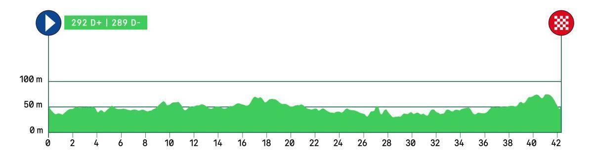 De route is relatief vlak maar er zitten wel enkele klimmen (totaal 1000 meter) en dalingen (totaal 500 meter) in.