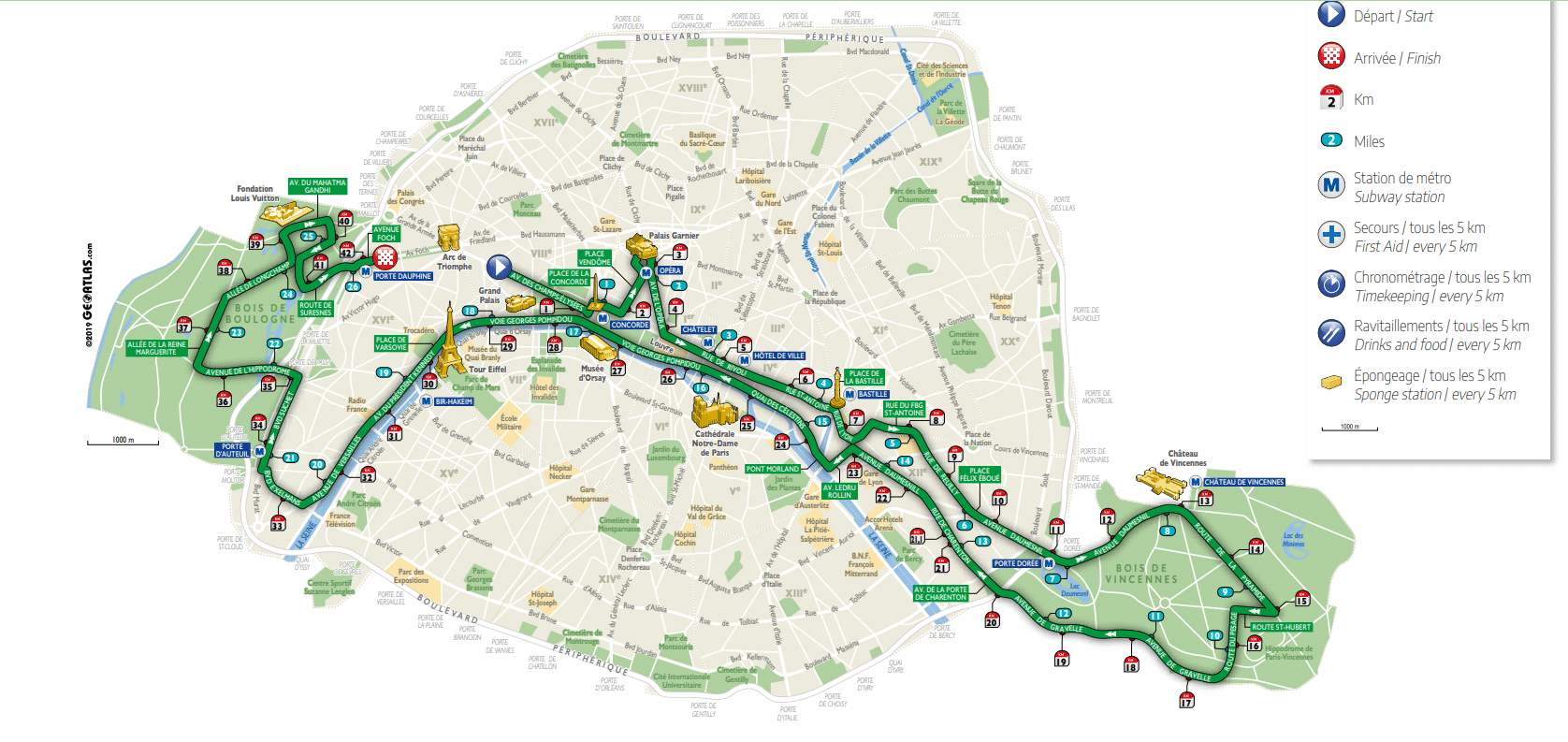 Vanaf de start op de Champs-Élysées loop je richting de Eiffel Tower, passeer je de Notre-Dame Cathedral en het Louvre Museum. Muziek, live-optredens en enthousiaste toeschouwers langs de route zorgen voor een feestelijke en energieke sfeer van start tot finish.