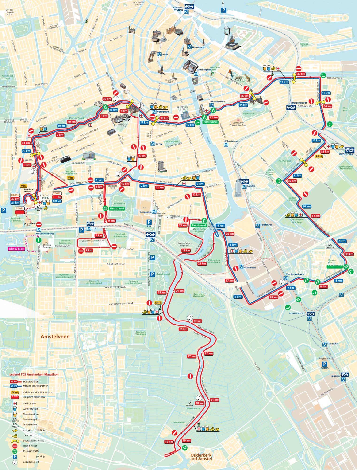De start en finish zijn in het Olympisch Stadion, wat zorgt voor een unieke sfeer. De route loopt langs bekende plekken zoals het Rijksmuseum, de Amstel en het Vondelpark, met veel publiek langs de kant.